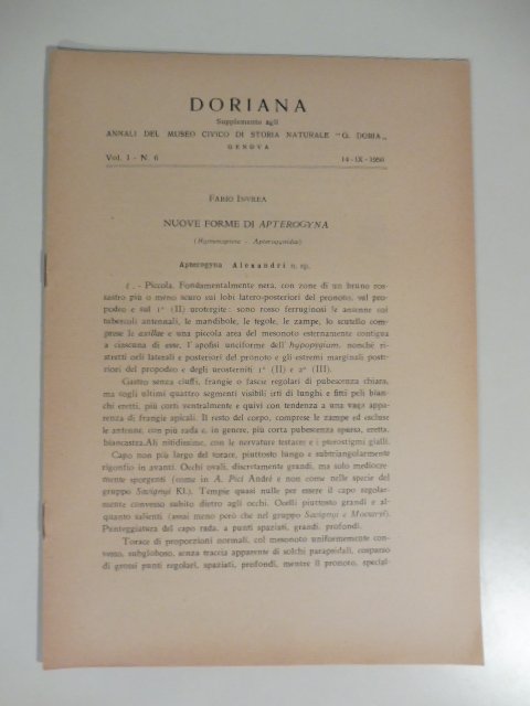 In 8 (cm 17 x 24,5), pp. 8. Esemplare privo di legatura all'origine. Supplemento agli Annali del Museo civico di Storia naturale G. Doria.