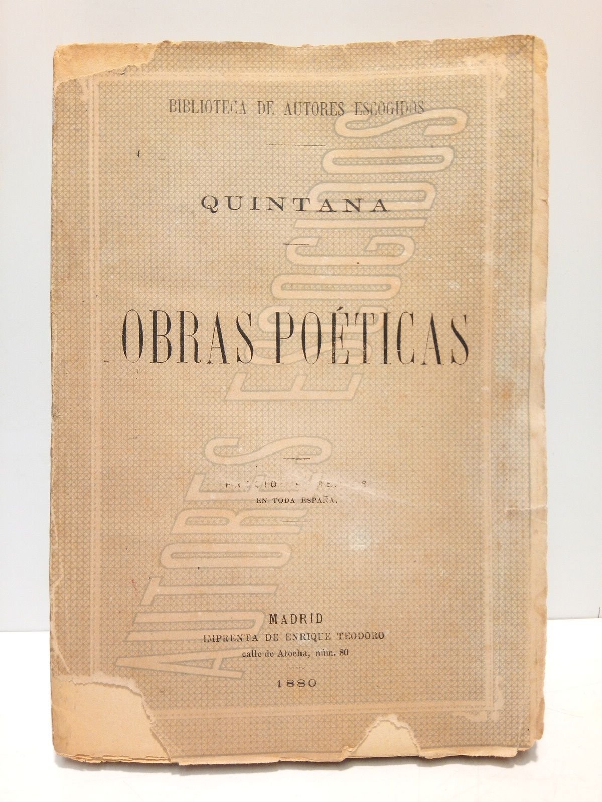 Madrid: Imp. de E. Teodoro, 1880.- 264 p.; 8º (17,5 x 12,1 cm); Intonso; Rústica Ed.- (Bibl. de Autores Escogidos. 3).* Lomo reforzado y la cubierta anterior con algunas faltas. Interior en muy buen estado. LITERATURA Y FILOSOFÍA ESPAÑOLAS DE LOS SIGLOS XIX-XXI Y SU HISTORIA EN GENERAL