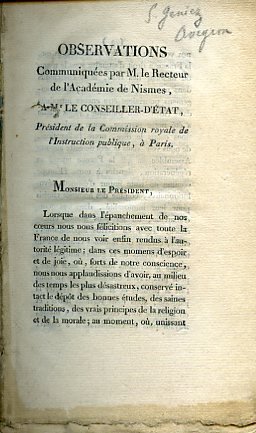 Observations communiquées par M. le Recteur de l'Académie de Nismes, a Mr le Conseiller d'État, Président de la Commission royale de l'Instruction publique, à Paris | Libri antichi e moderni | Tedenat (Pierre)