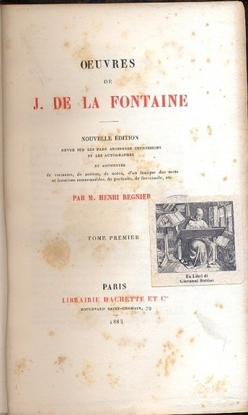 In 8°, m.pelle. Piatti marmorizzati. Ogni vol. è di ca. 450 pp. Disponiamo: 1° - Notice Biographique sur La Fontaine, Fables, dal Livre cinquieme. 2° - Fables. Da livre sixieme a livre neuvieme. 3° - Fables. Da livre dixieme a livre douzieme. 7° - Theatre. 8° - Les amours de psyche et de cupidon, Fragments du songe de vaux, Poesies diverses, Odes, Pieces Melees, Traduction en versi. 9° - Poesies Diverses, Ballades et Rondeaux, Sonnets, Madrigaux, Dizains, Sizains, Epitafhes, Vers pour des Portraits, Epigrammes, Epitres, Lettres a sa femme, a Divers. Fioriture. Ottimo stato.