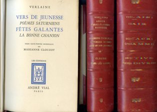 6 voll. in 3 tomi in-8° (231x145mm) in legatura m. pelle rossa e angoli con titolo e fregi in oro su dorsi a nervetti. Sguardie marmorizzate, segnacoli. Brossure originali conservate. Stato di nuovo. Comprende: 1) Vers de jeunesse. Poème Saturniens. Fêtes Galantes. La Bonne chanson, pp. 171, (9). 16 acqueforti a colori f.t. di Marianne Clouzot. 2) Romances sans paroles. Sagesse. Jadis et Naguère, pp. 215, (9). 16 acqueforti a colori f.t. di Roger Ferréro. 3) Amour. Parallelement. Bonheur, pp. 219, (9). 16 acqueforti a colori f.t. di Berhommé Saint-André. 4) Chansons pour elle. Liturgies intimes. Odes en son honneur. Élégies, Dans les limbes, pp. 168, (8). 16 acqueforti a colori f.t. di Perraudin. 5) Chair. Dédicaces. Épigrammes, pp. 176, (8). 16 acqueforti a colori f.t. di Schem. 6) Invectives. Poésies diverses, pp. 234, (10). 16 acqueforti a colori f.t. di Raoul Serres. Tiratura di 1.700 esemplari numerati (n° V dei 75 'sur vélin du Marais Crèvecoeur); le acqueforti dei vari volumi vennero tirate 'a la poupée et au repérage' sui torchi de 'La Tradition' di A. Malakoff.