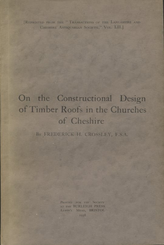 Name to half-title page. No other marks or inscriptions. No creasing to covers. A very clean very tight copy with bright unmarked boards, slightly dusty top of page edges and no bumping to corners. 70pp. A study of the different timber roof types found in Cheshire churches. Illustrated with twenty-seven photographs. From the Transactions of the Lancashire and Cheshire Antiquarian Society - Vol LII. Extremely scarce.