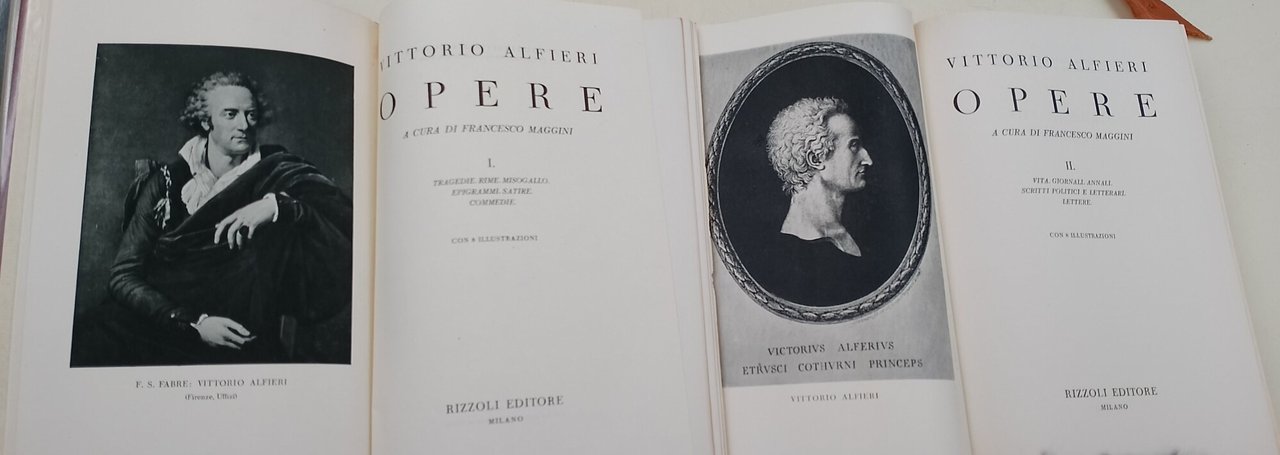2 voll. in cofanetto, leg. aed in pelle con sovrac. in acetato, pp. 963+945. ritratti in n. in antiporta: vol. I Tragedie -Rime- Misogallo- Epigrammi-Satire-Commedie, con 8 illustrazioni; Vol. II, Vita-Giornali- Annali-Scritti politici e letterari-lettere , con 8 illustrazioni. A cura di Francesco Maggini.