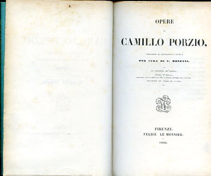 In-8°, pp. XL, 319, (1), legatura del tempo m. pelle e angoli con titolo in oro al dorso. Bell'esemplare con usuali fioriture. Edizione fiorentina di metà Ottocento, curata da Cirillo Monzani (cui si debbono la vita del Porzio e le annotazioni contenute nelle pp. in nn. romani), delle principali opere del Porzio, tra cui quella celeberrima sulla Congiura dei Baroni, ordita nel 1485 dal Principe di Salerno, Antonello II Sanseverino, ai danni del Re di Napoli Ferdinando I. L'edizione della Congiura è esemplata, salvo modifiche di punteggiatura, su quella aldina del 1565. Indice delle cose notabili alle pp. 313 e sgg.