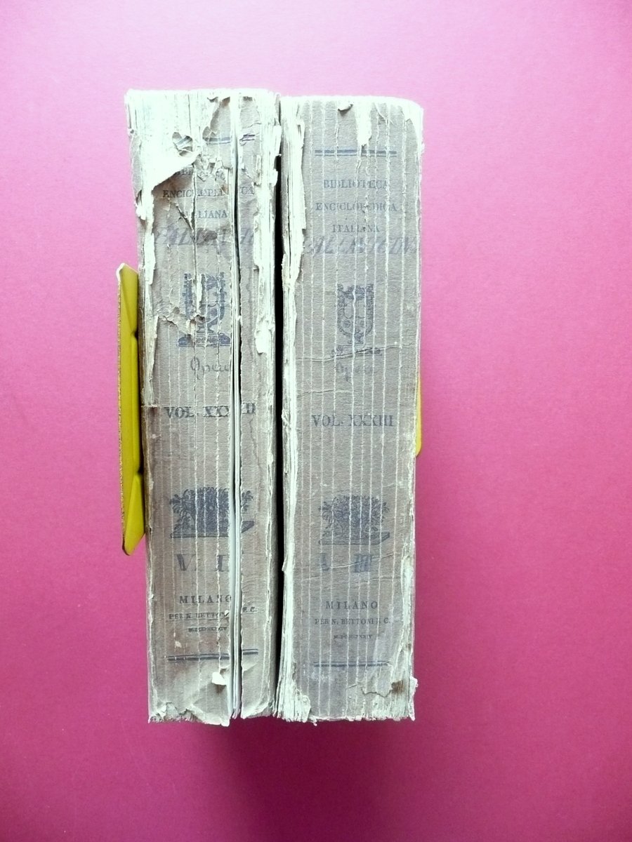 Opere del Cardinale Sforza Pallavicino Volume I - II (opera completa in due volumi) Per Nicolò Bettoni, Milano 1834; cm 24,5x15,5; pp. [12]-762 (volume I); pp. 830 (volume II); brossura ed. d'attesa, con titolo al dorso. Opera completa in due volumi. Condizioni di conservazione Volumi entrambi in discrete condizioni con tracce d'uso, brossure leggermente ingiallite, dorsi con segni di utilizzo, qualche fessurazione e alcune piccole mancanze, con conseguente allentamento delle cuciture (vedi foto). Interni buoni con alcune piccole bruniture; angoli di qualche pagina con pieghetta. Margini con barbe. Opera completa in due volumi. I volumi fanno parte della collana Biblioteca Enciclopedica Italiana", volumi XXXII e XXXIII. SETT177.L15969 N "
