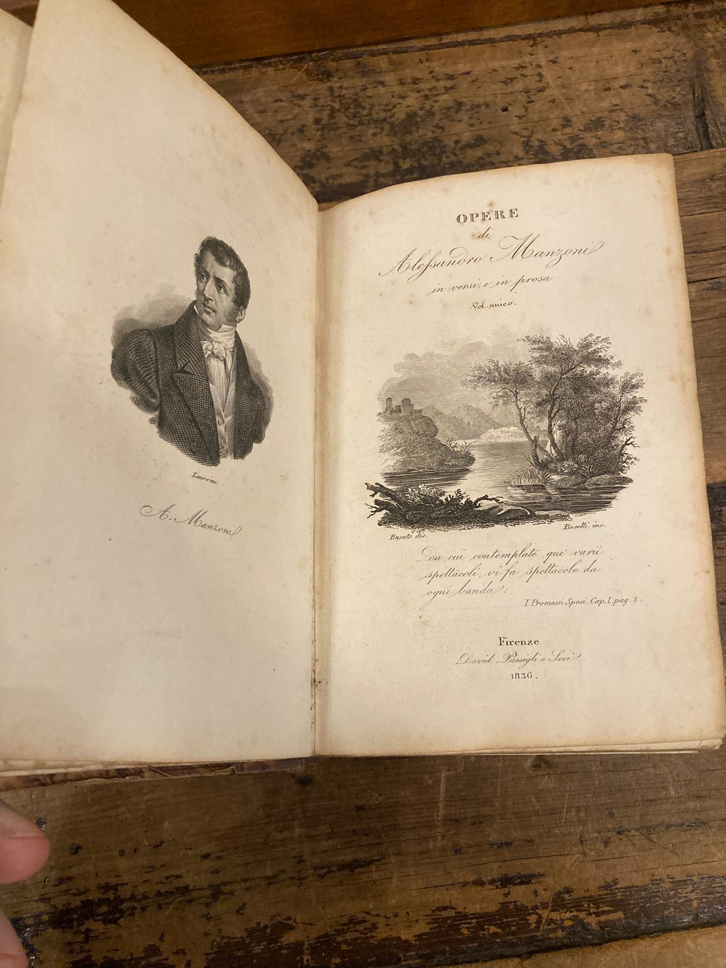 In-8° antico (19x13 cm), pp. (8), 712, (2) di dichiarazione delle incisioni contenute nel volume, mezza pelle marrone con angoli, titolo, fregi e filetti dorati al dorso. Fregio all' occhietto, ritratto inciso dell' autore al controfrontespizio, frontespizio figurato con vignetta, intercalate al testo in tavole singole altre 8 vignette incise protette da velina. Testo stampato su du colonne. Occasionali bruniture o arrossature marginali a poche pagine. Più che buon esemplare. Rara seconda impressione fiorentina per i tipi Passigli (questa del 1836-37 è emendata e aumentata rispetto alla prima impressione del 1832) di queste opere del Manzoni racchiudente: I promessi sposi (con in calce note illustrative dedotte dai Ragionamenti sulla Guerra Longobardica di Cesare Cantù); Osservazioni sulla morale cattolica; Il conte di Carmagnola ; Adelchi; poesie varie tra cui figurano 'In morte di Carlo Imbonati. Versi a Giulia Beccaria' e l' ode 'Il Cinque maggio'.