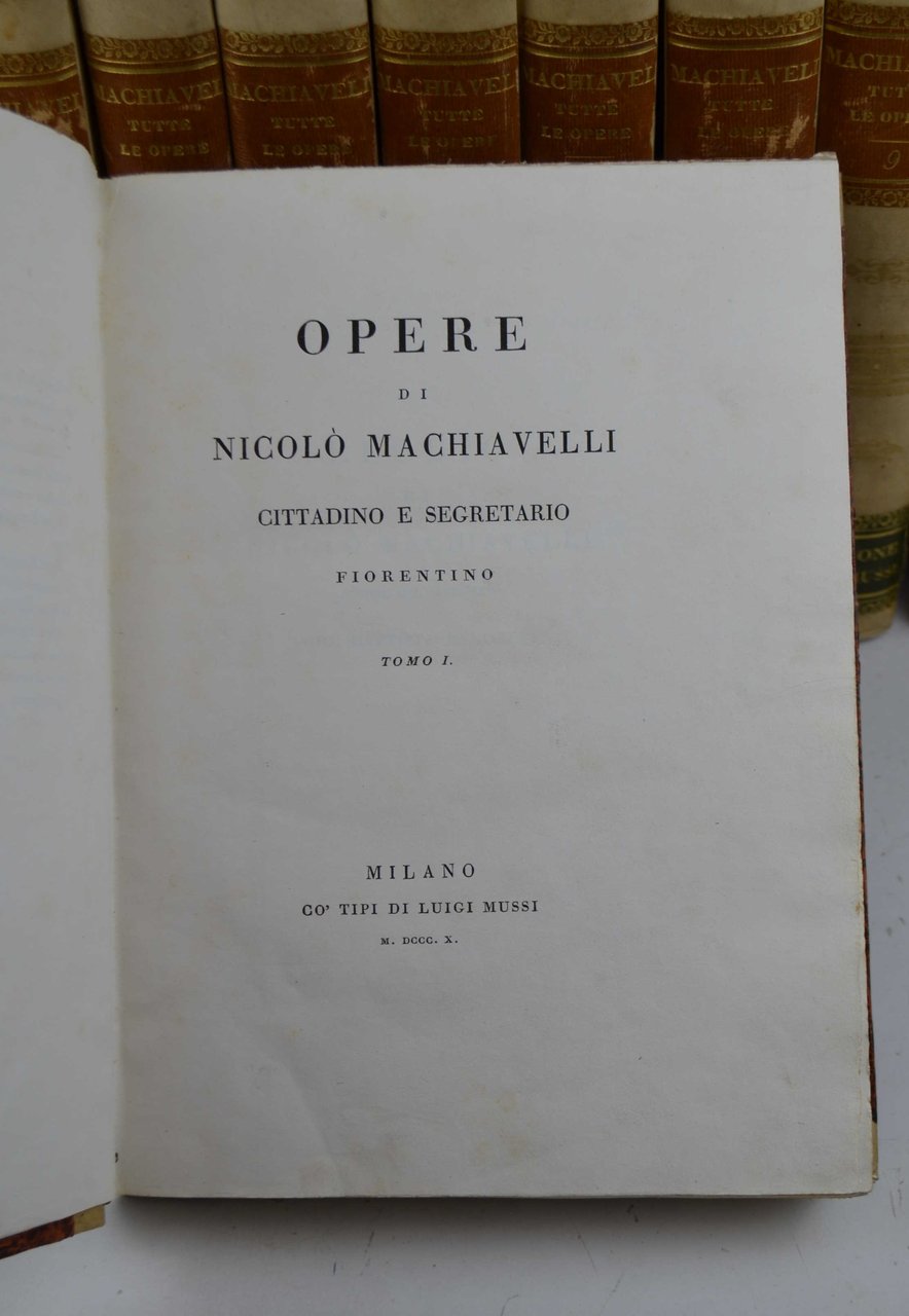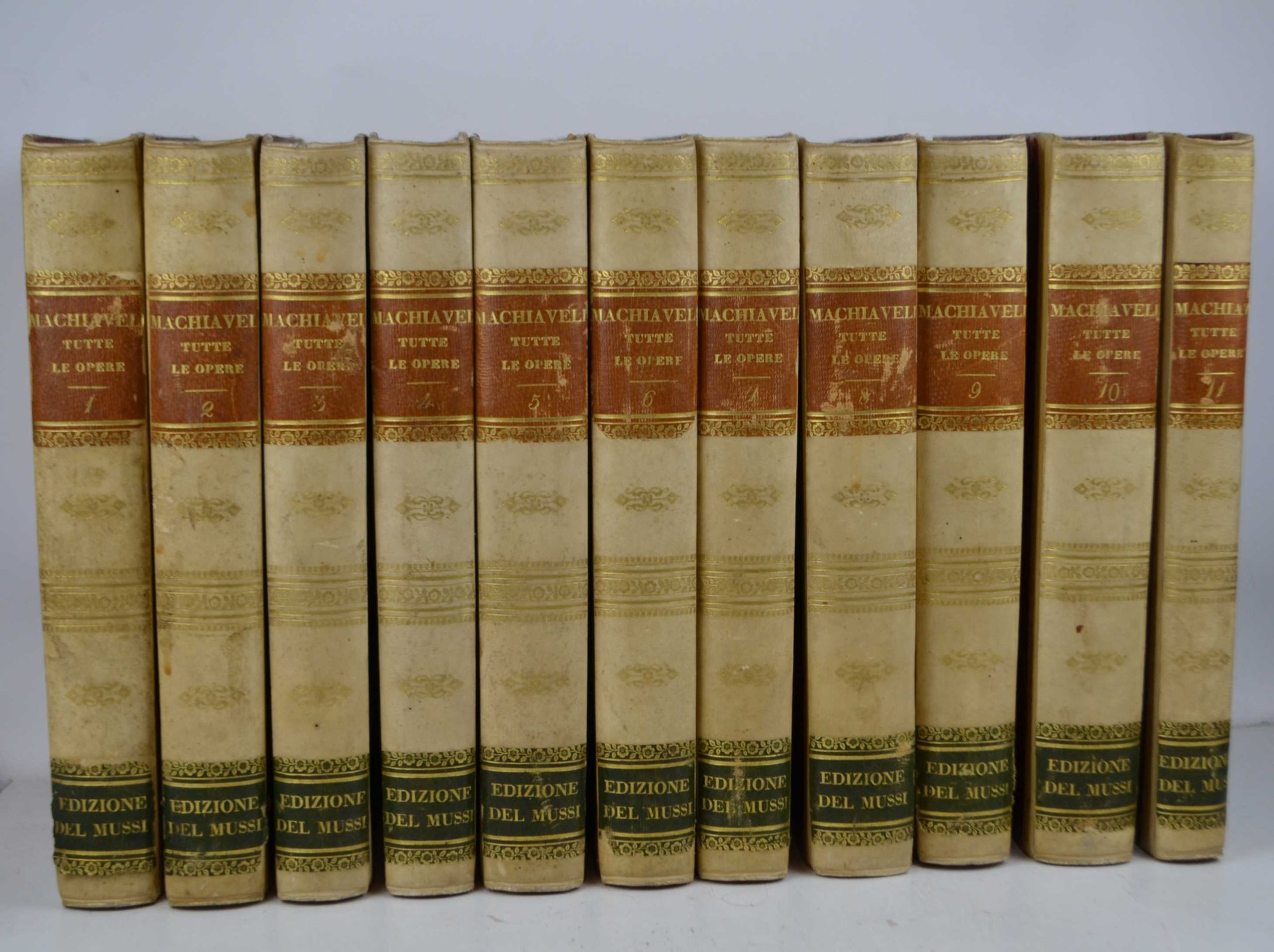 Undici volumi di cm. 31, pp. 4.000 ca. complessive. Con una tavola f.t. incisa in rame. Solida ed elegante legatura strettamente coeva in mezza pergamena, dorsi lisci con fregi in oro e tiutoli su doppio tassello bicolore. Esemplare fresco, a pieni margini e ben conservato. Celebre edizione impressa con la perizia che contraddistingueva l'editore Mussi. Alcuni esemplari censiti presentano un ritratto del Machiavelli che fu inserito solo in poche copie e qui non presente. E' invece presente il foglio con la giustificazione della tiratura in cui si certifica che la presente edizione è stata impressa in duecento esemplari in carta rela velina bianca ad personam, con firma finale del Mussi e Il nome della persona cui era indirizzata l'opera.