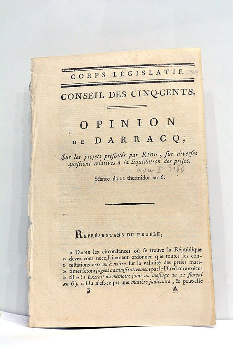 Opinion sur les projets présentés par Riou, sur diverses questions relatives à la liquidation des prises. | Libri antichi e moderni | Darracq.