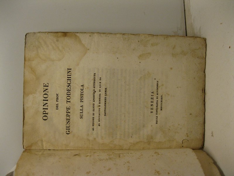 Opinione sulla pistola al priore di Santo Apostolo attribuita al Boccaccio e rimessa in luce da Bartolommeo Gamba | Libri antichi e moderni | Todeschini Giuseppe
