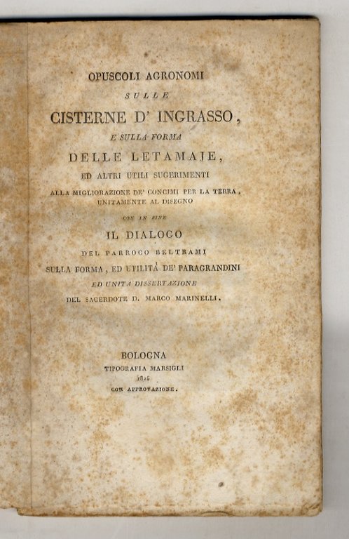 OPUSCOLI agronomi sulle cisterne d'ingrasso e sulla forma delle letamaje e ed altri utili sugerimenti [sic] alla migliorazione de' concimi per la terra, unitamente al disegno. Con in fine il Dialogo del parroco Beltrami sulla forma edutilità de' paragrandini ed unita dissertazione del sacerdote d. Marco Marinelli. | Libri antichi e moderni |