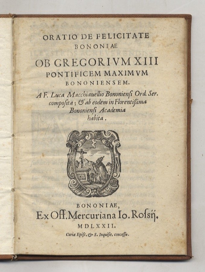 Oratio de felicitate Bononiae ob Gregorium XIII. pontificem maximum Bononiensem. A F. Luca Macchiavellio Bononiensi Ord. Ser. composita; & ab eodem in florentissima Bononiensi academia habita.