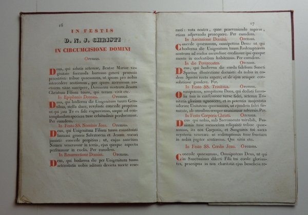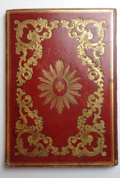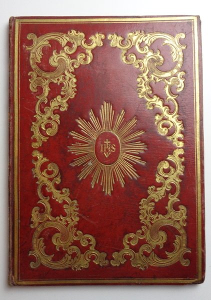 Un volume (20x28 cm) di (2)-26 pagine. Testo e titolo in rosso e nero. Qualche tratto a matita nel testo; una lettera manoscritta allegata in fine. Bella legatura in tutta pelle rossa, cornice dorata con ampie volute ai due piatti, con stemma gesuitico IHS ovale con raggi; dorso liscio ornato e dorato; tagli dorati, risguardie in carta setata bianca. Un'ombra scura alla pelle del piatto anteriore, peraltro condizioni molto buone. Questo tipo di legature gesuitiche, molto ricche e barocche, sono piuttosto rare.
