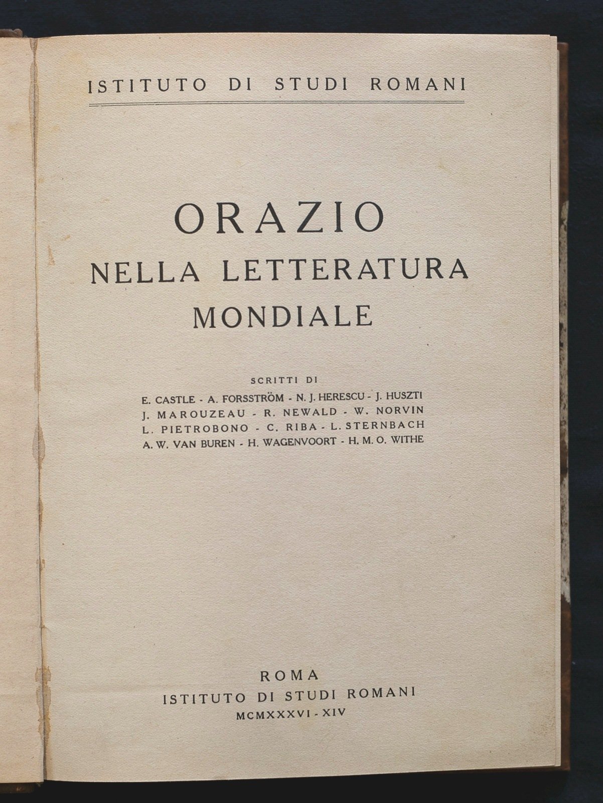 Gli autori: Castle E. Forsstrom A. Herescu N.J. Huszti J. Marouzeau J. Newald R. Norvin W. Pietrobono L. Riba C. Sternbach L. Van Buren A.W. Wagenvoort H. White H.M.O. Piatto muto, titolo e fregi in oro al dorso. Abrasioni esterne, leggero ingiallimento interno, tagli polverosi con trascurabili fioriture