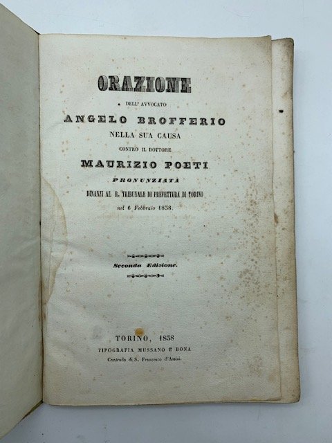 5 opuscoli legati in un volume in 8 (cm 15 x 22): Orazione dell'avvocato Angelo Brofferio nella sua causa contro il Dottore Maurizio Poeti, pp. 32; Ragionamento pronunziato. nella causa del signor Dottore Maurizio Poeti convenuto contro.Angelo Brofferio. (Torino, Fontana, 1838), pp. 23 + (1 bianca); Cenni sopra l'orazione del sig. Avvocato Angelo Brofferio attore presentati al R. Tribunale di Prefettura (Torino, Fontana, 1838), pp. 12; Osservazioni sui cenni presentati dal Signor Dottore Maurizio Poeti, pp. 15 + (1 bianca) ma mancante del primo foglio (quindi privo di dati editoriali); Sentenza pronunziata dal Regio Tribunale in Torino nella causa., pp. 23 ma mancante del primo foglio (quindi privo di dati editoriali). Manca un lembo di carta del primo foglio bianco di sguardia. Gore sparse e fioriture alle pagine, qualche traccia di inchiostro. Cartonatura coeva con danni riparati al dorso e aloni ai piatti. Raccolta di 5 opere relative alla causa intentata da Angelo Brofferio contro Maurizio Poeti, giornalista pubblicista del giornale "Il Pirata", il quale aveva accusato Brofferio di essere un delatore. Brofferio ebbe parte attiva nei moti del 1821, ma soprattutto nella congiura del 1831, promossa da un gruppo di ufficiali dell'Esercito sardo aderenti alla societa' segreta dei Cavalieri della Liberta'. In contatto con alcuni esuli piemontesi in Svizzera, costoro - fra cui appunto Brofferio, Giuseppe Berasni, Massimo Cordero di Montezemolo - svilupparono fra la fine del 1830 e l'inizio del 1831 un progetto cospirativo che aveva come obiettivo quello di ottenere dal re Carlo Felice la concessione di una Costituzione e la lotta contro l'Austria. La trama falli' per il tradimento di uno dei congiurati. Vennero arrestati tutti tranne Brofferio per cui le accuse di tradimento finirono per ricadere su di lui. Nacque in seguito questa polemica tra Maurizio Poeti, dalle colonne di "Il Pirata", e lo stesso Brofferio che rispose sul giornale "Il Messaggiere Torinese"  fino a quando Brofferio intento' causa contro il giornalista. La parola fine fu posta dalla sentenza del Tribunale del 1838 che scagionava Brofferio da ogni accusa.
