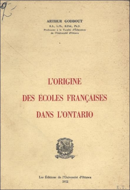 ORIGINE DES ECOLES FRANCAISES DANS L'ONTARIO. | Libri antichi e moderni | Godbout A.