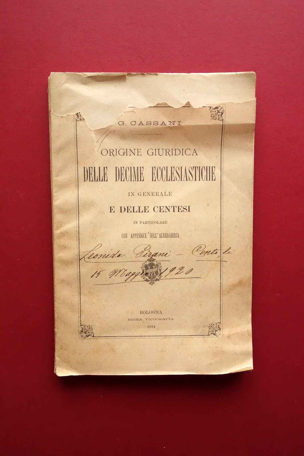 Origine Giuridica delle Decime Ecclesiastiche G. Cassani Bologna 1894 Cento Raro | Libri antichi e moderni |