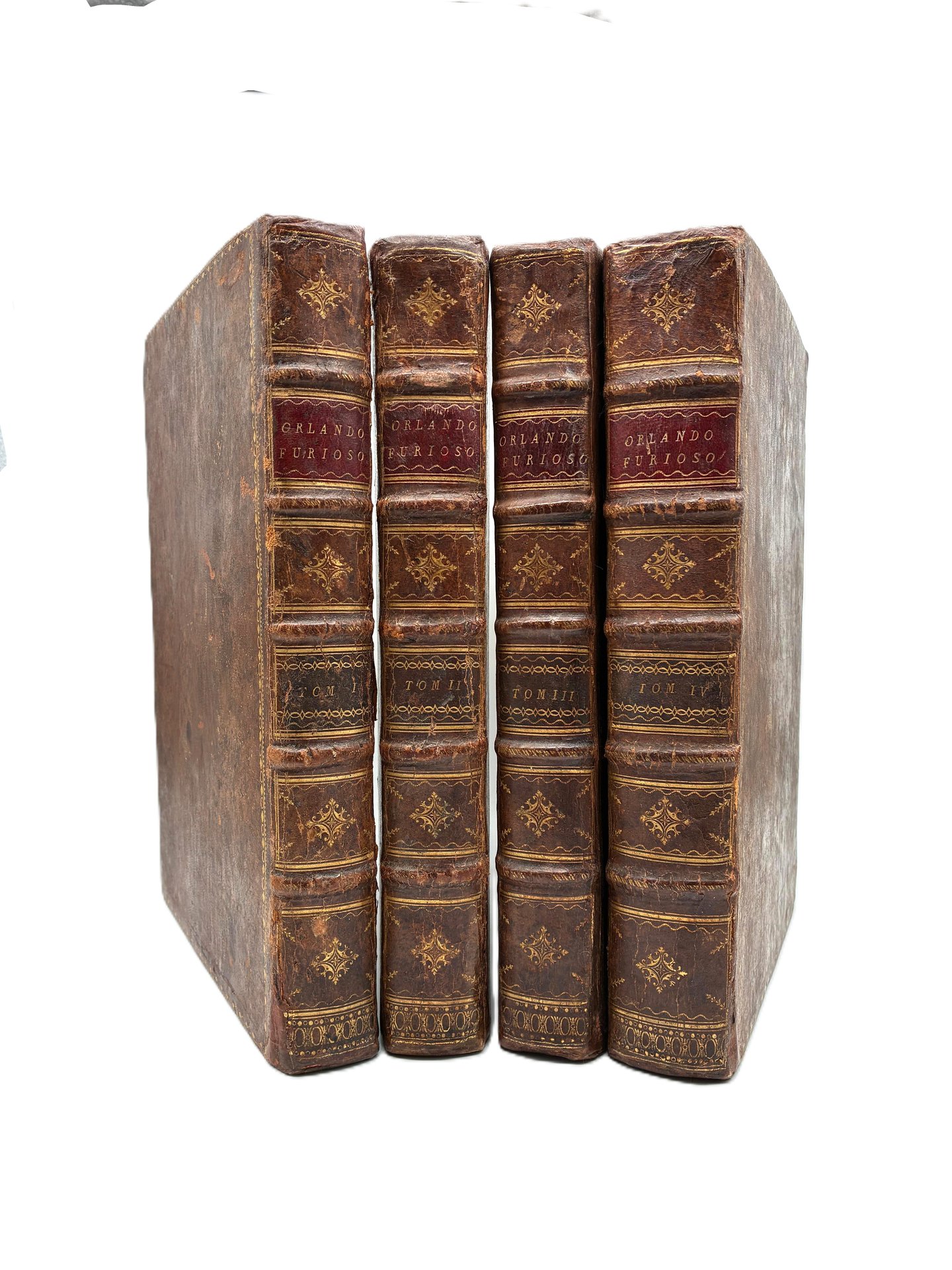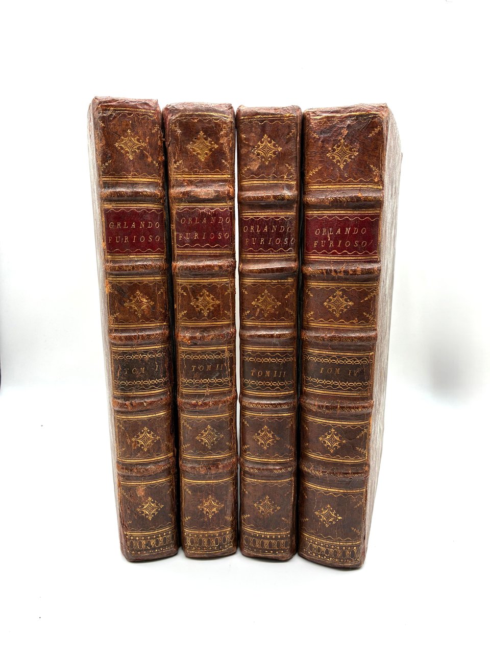 Quattro volumi in-folio, completo di testo, errata, bianche e 59 tavole, capolettera finemente istoriati, finalini e culs-de-lampe. Legatura coeva in piena pelle in ottimo stato. Autore, titolo e numerazione dei volumi in oro ai dorsi finemente lavorati con decori floreali. Tagli spruzzati di rosso. Fogli interni bianchi e freschi con ampia marginatura. Opera in condizioni perfette.