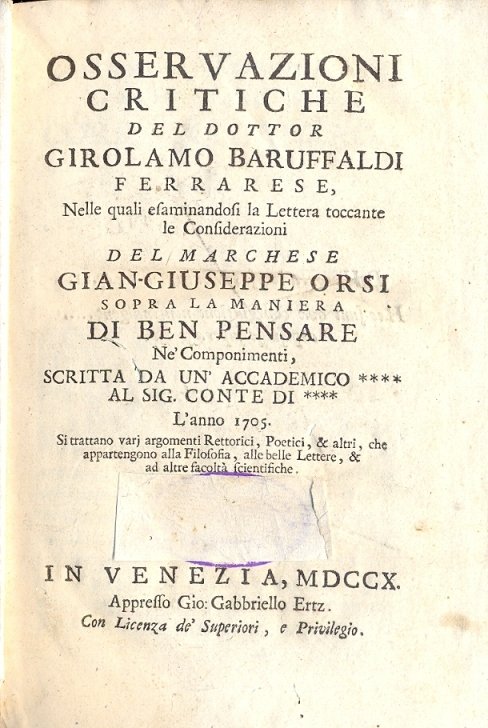 Osservazioni critiche del dottor Girolamo Baruffaldi. Nelle quali esaminandosi la lettera toccante le considerazioni del Marchese Gian Giuseppe Orsi sopra la maniera di ben pensare ne' componimenti.