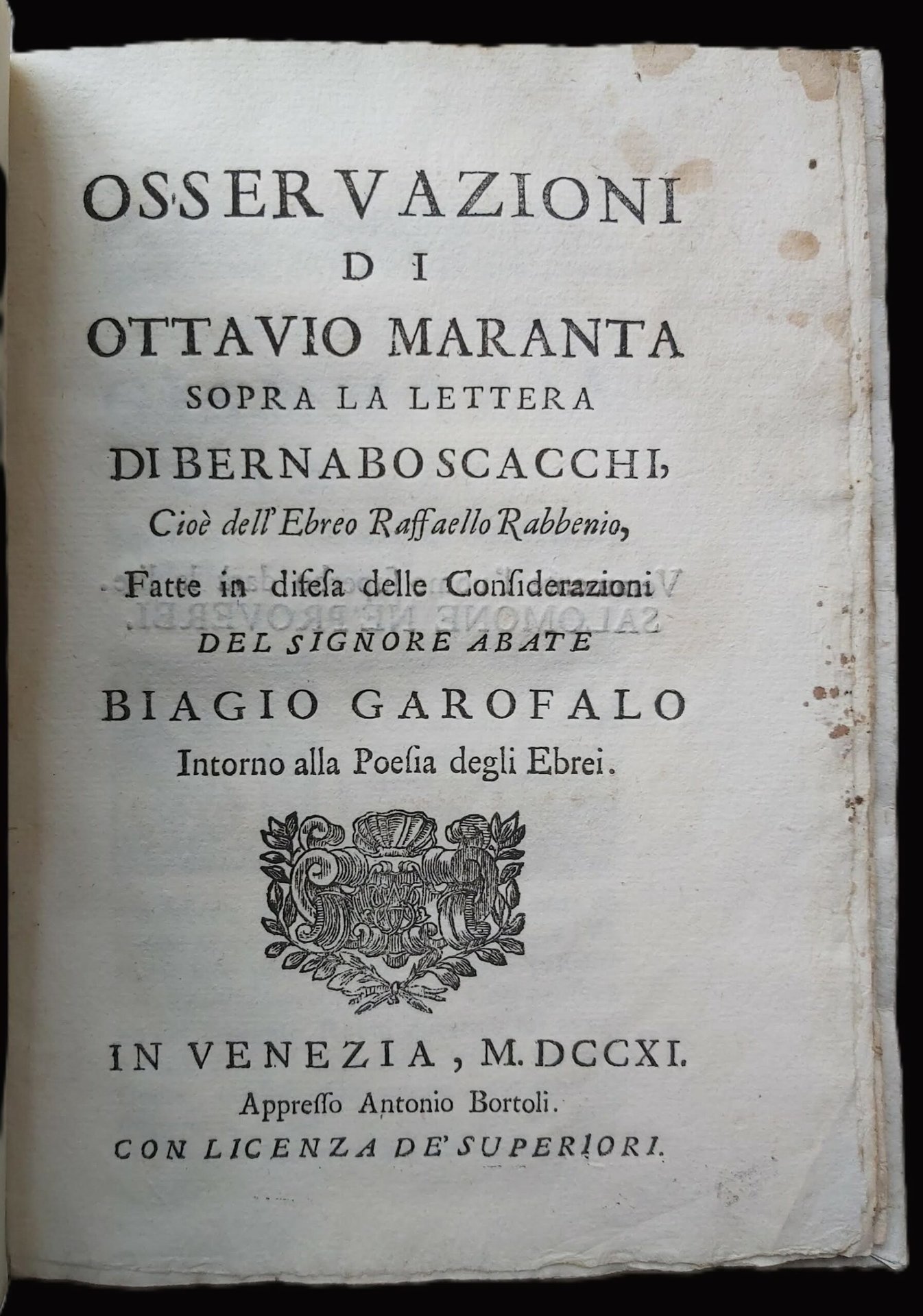 OSSERVAZIONI di. sopra la Lettera di Bernabò Scacchi cioé dell’Ebreo Raffaello Rabbenio fatte in difesa delle considerazioni del Signore Abate Biagio Garofalo intorno alla Poesia degli Ebrei. | Libri antichi e moderni | Maranta Ottavio.