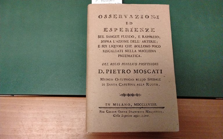 Osservazioni ed esperienze sul sangue fluido, e rappreso; sopra l'azione dell'arterie; e sui liquori che bollono poco riscaldati nella macchina pneumatica | Libri antichi e moderni | Pietro Moscati
