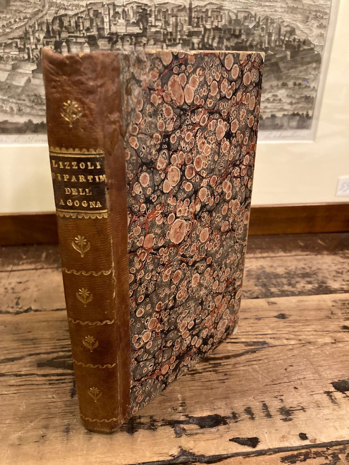 In-8° (205x130mm), pp. (4), 178, (1), legatura coeva in mezza pelle con titolo su tassello e fregi in oro al dorso, tagli marmorizzati. Restauri al piatto posteriore ma per il resto fresco esemplare. Fra le pp. 172-173, una tabella ripiegata delle miniere del dipartimento. Fresco esemplare, in barbe e su carta forte. Unica e rara edizione, pubblicata con lo pseudonimo 'Luigi Lizzoli', di quest'opera dovuta in realtà a Vincenzo Cuoco (Civita Campomarano, Campobasso, 1770-Napoli, 1823), il grande patriota, letterato e storico della rivoluzione napoletana autore, fra l'altro, del 'Platone in Italia'. Il Dipartimento dell'Agogna fu uno dei dipartimenti della Repubblica Italiana (1802-1805) e del Regno d'Italia di Napoleone, corrispondente alle attuali provincie di Novara, Verbano-Cusio-Ossola e, in parte, Pavia e Vercelli. Esso venne soppresso dopo la caduta di Bonaparte e, in seguito al Congresso di Vienna, il suo territorio entrò a far parte del Regno di Sardegna. Nella presente scrittura il Cuoco fornisce preziose informazioni sulla geografia e topografia del territorio, la demografia, la caccia, la pesca, le miniere, la pastorizia, l'agricoltura, l'economia e il commercio, la climatlogia, le malattie più comuni, le arti e il commercio, le strade, i fiumi, la mendicità e il pauperismo, la beneficenza e le opere pie, l'istruzione, gli orfanatrofi, la polizia e le forze dell'ordine, l'amministrazione della giustizia, le finanze, la storia locale. Il penultimo capitolo (pp. 152-161) riguarda la Valsesia. 'Nell'aprile il Cuoco, accettò una proposta di collaborazione avanzatagli, col benestare dei governo, dal conte Lodovico Lizzoli, commissario straordinario del dipartimento dell'Agogna. Si trattava di riordinare un vasto materiale documentario in gran parte già raccolto, di redigere, su quelle basi, una dettagliata descrizione statistica, geografica, economica del Novarese. Si accinse all'impresa come ad un lavoro occasionale ed invece finì con lo scoprire in quella indagine storico-sociale una direttrice di lavoro alla quale avrebbe dedicato, per tutta la vita, parte delle sue energie intellettuali. L'operetta, scritta di suo pugno, uscì col nome del Lizzoli ed ebbe fortuna. ' (Mario Themelly in D.B.I., XXXI). Melzi, II, p. 298. Manni, II, 7006 (ignora che l'autore sia il Cuoco e lo cita con lo pseudonimo).