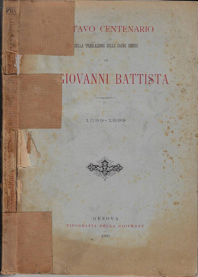 Opera edita in occasione dell'ottavo centenario della traslazione delle sacre ceneri di S. Giovanni Battista. Copertina brunita dal tempo presentante segni di usura ai margini con piccoli strappi e mancanze agli stessi ed al dorso e macchioline di fioritura ai piatti. Da segnalare rinforzi in carta al dorso. Pagine brunite dal tempo, in particolare ai tagli e sporadicamente fiorite. Da segnalare lieve allentamento delle legatura. Numero pagine 194.