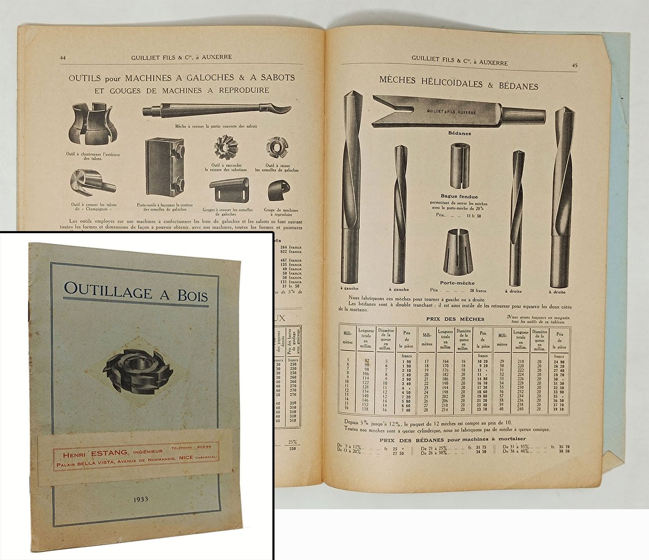 catalogo illustrato della ditta francese di Auxerre (Yonne) 'Guilliet Fils & Cie / maison fondée en 1847' dedicato agli utensili per la lavorazione del legno (lames de raboteuses - mèces - lames de scies). Catalogo, in lingua francese, di 52 pagine, datato 1933. Formato: 16 x 24 cm circa. Per i vari utensili sono riportate le caratteristice tecniche, i prezzi, e le immagini in nero. Stato di conservazione: sulla copertina anteriore è stata attaccata un'ampia etichetta di un negozio rivenditore degli utensili (di Nizza); piccole macchioline gialle sulla copertina, qualche piccola 'orecchia' di qualche pagina, ma, nel complesso, un buon esemplare.