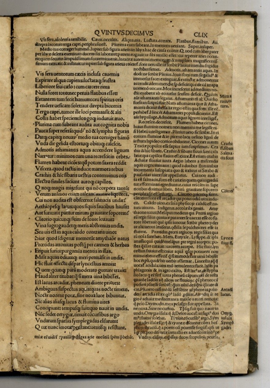 (Venetiis), (Georgius de Rusconibus), (Die xx. Aprilis 1517), in-folio, legatura settecentesca in mezza pelle con punte, carte [8], CLIX. Con frontespizio in cornice xilografica, prima pagina di testo inquadrata da cornice figurata e 59 belle grandi vignette xilografiche n.t. Modesto esemplare, privo delle carte t3, u8 e dell'intero fascicolo finale x10. Inoltre molti camminamenti di tarlo che ledono in minima parte il testo, vasti restauri reintegrativi settecenteschi alle prime 8 carte (i restauri sono nella maggior parte dei casi ai margini, ma le prime 5 carte recano anche mancanze dovute a tarli successivi a questi interventi), gore, qualche macchia, strappetto dovuto ad usura a c. k8, bruniture evidenti a diversi fascicoli, altri restauri alle ultime 2 carte. Postille antiche marginali. Edizione celebre per il corpus iconografico.