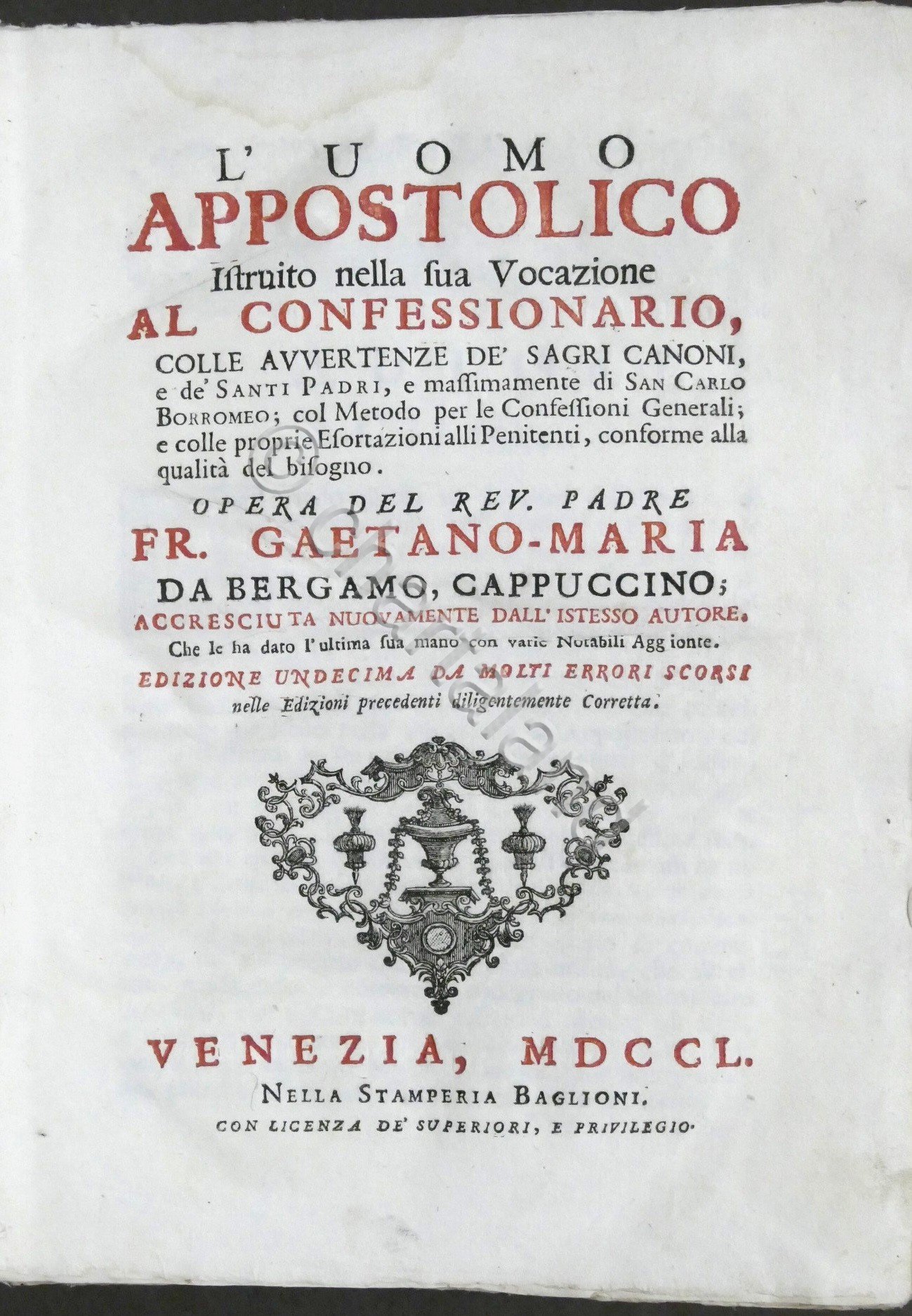 L'uomo appostolico istruito nella sua vocazione al confessionario, colle avvertenze de' sagri canoni, e de' Santi Padri, e massimamente di San Carlo Borromeo ... opera del rev. padre Fr. Gaetano-Maria da Bergamo, cappuccino...