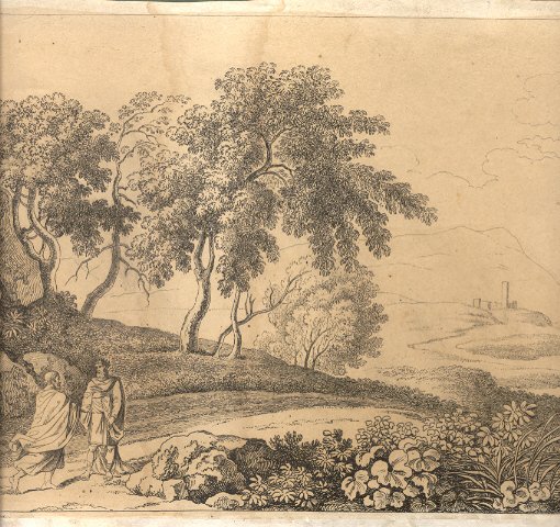 Stampa su cartoncino di cm. 20,5 x 38. Raffigurante , in primo piano, due personaggi con alberi, siepi e lago, e , sullo sfondo colline e mura di castello.