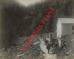 Foto all'albumina, cm. 27 x 22 c.a montata su cartoncino, 1890/1900 circa. Paesaggio montano, con chiesetta ed escursionisti.