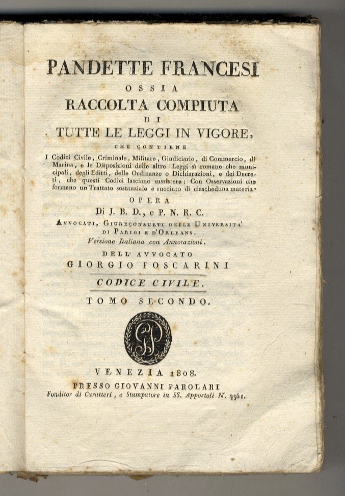 Pandette francesi ossia Raccolta compiuta di tutte le leggi in vigore, che contiene i Codice Civile, Criminale, Militare, Giudiciario, di Commercio [.] Opera di J.B.D., e P.N.R.C. avvocati giureconsulti delle università di Parigi e d'Orleans. Versione italiana con annotazioni. Dell'avvocato Giorgio Foscarini. Codice civile. Tomo primo [- tomo secondo]. | Libri antichi e moderni |