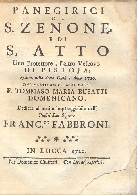 Panegirici di S. Zenone e di S. Atto, uno Protettore, l'altro Vescovo di Pistoia. Recitati nella detta città l'anno 1720 dal molto Reverendo Padre F.Tommaso Maria Busatti domenicano.