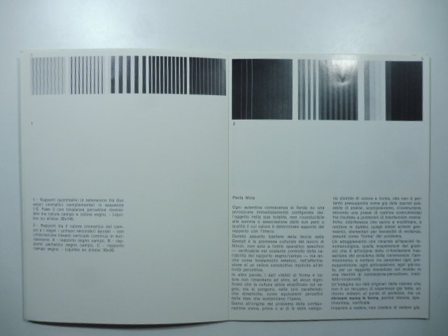 In 8 (cm 16 x 21), pp. 18 con riproduzioni di opere in bianco/nero e a colori. Brossura editoriale. Catalogo della mostra. Con testi di presentazione di Paola Mola, Alberto Veca, Attilio Marcolli, elenco delel mostre (personali e collettive dell'artista). Paolo Minoli dal 1977 al 1978 fa parte del gruppo di ricerca 'L'interrogazione sistematica' con Nato Frasca' e Antonio Scaccabarozzi. Dal 1979, all'Accademia di Belle Arti di Brera di Milano, e' docente del corso speciale di Cromatologia e collabora, in qualita' di consulente, con aziende per l'applicazione di soluzioni cromatiche nella produzione industriale.