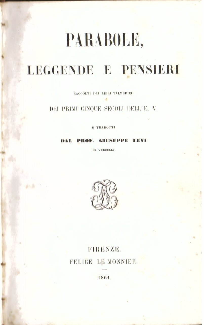 Parabole, leggende e pensieri raccolti dai Libri Talmudici dei primi cinque secoli dell'E. V. e tradotti dal prof. Giuseppe Levi di Vercelli