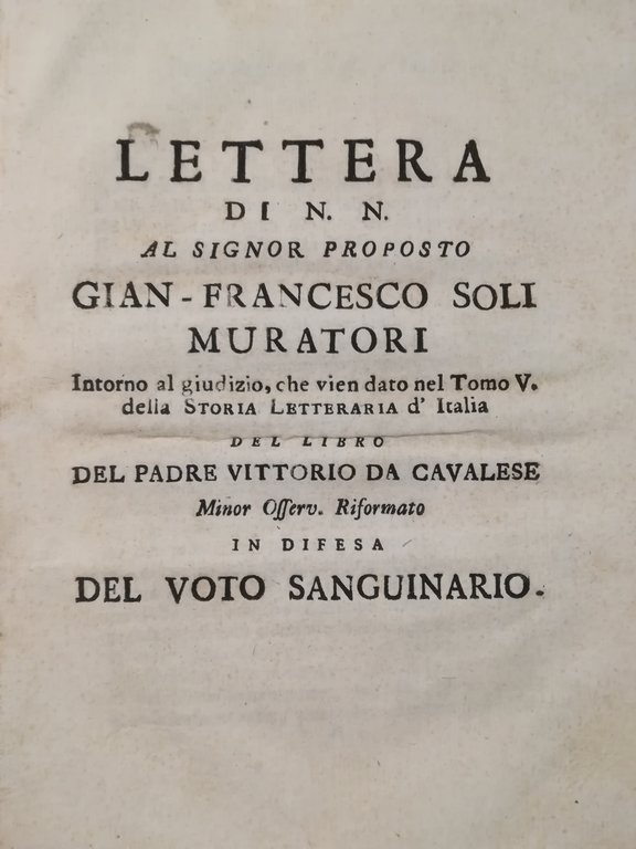 69, [3] p.; 18 cm. Brossura recente muta in carta marmorizzata. Fioriture, sopratutto alle prime e ultime pagine, area di stampa di alcune pagine un po' brunita. Una mancanza al margine di p. 53 con perdita di pochissimo testo. Nel complesso buono. Tratta della polemica, sorta dopo la rivoluzione francese e con la temporanea caduta del potere temporale del Papa, sulla possibilità che i religiosi prestassero giuramento allo Stato, e che i beni della Chiesa potessero essere venduti Buono (Good)