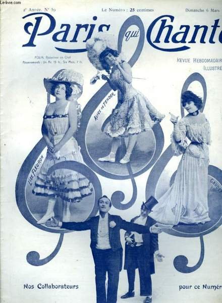 6 mars 1904. In-4. En feuillets. Etat d'usage, Couv. défraîchie, Dos satisfaisant, Intérieur acceptable. 15 pages. Nombreuses illustrations et gravures en couleur monochrome, dans le texte et hors texte. Nombreuses partitions pour chants + paroles. . . . Classification Dewey : 780-Musique