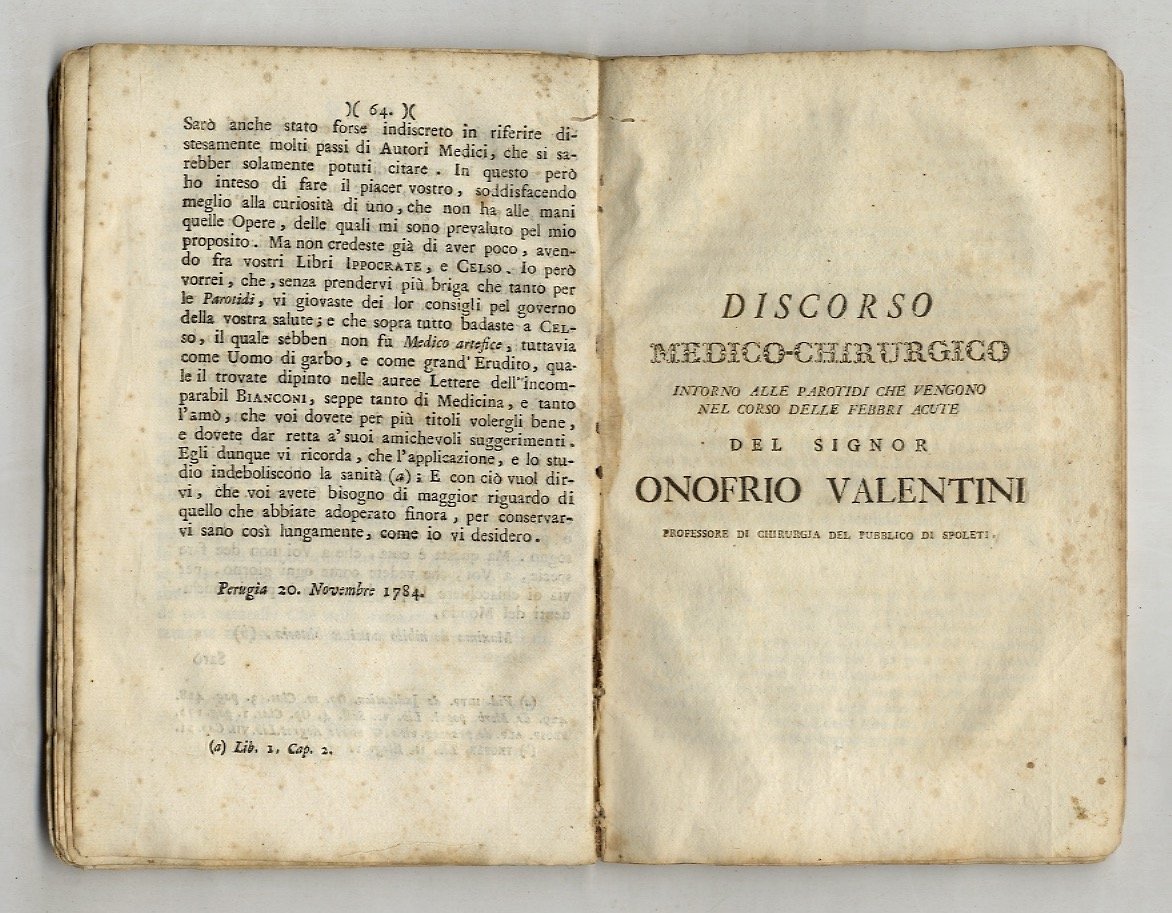 Parotidi (Delle) ne' mali acuti. Opuscoli due. (Contiene:) MARIOTTI Annibale, Delle Parotidi ne' mali acuti. Dissertazione epistolare (.) diretta al Signor Abate Gaetano Bellini. (Segue:) VALENTINI Onofrio, Discorso medico-chirurgico intorno alle Parotidi che vengono nelle febbri acute (.).