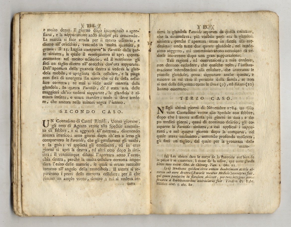In Perugia, presso Carlo Baduel, 1785, in-8, copertina muta coeva in br., pp. (2), 64; XXX, (2). La seconda opera ha proprio occhietto, ed è datata in fine: 1786. Forellini di tarlo al margine interno della coperta anteriore e di alcune carte; dorso rinforzato. L'editore Baduel spiega che spinto da alcuni studenti di medicina dell'Università di Perugia riunitisi nella sua libreria, decise di "farle pubbliche colle stampe" due scritture sulla cura delle parotidi: una di Mariotti (1738-1801), cattedratico in quella università, letterato ed attivista politico di idee liberali; l'altra di Valentini, professore di Chirurgia del pubblico Ospedale di Spoleto. Edizione originale.