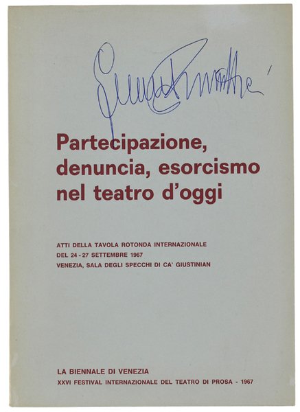 PARTECIPAZIONE, DENUNCIA, ESORCISMO NEL TEATRO D'OGGI. Atti della tavola rotonda internazionale del 24-27 settembre 1967. | Libri antichi e moderni | Autori Vari.