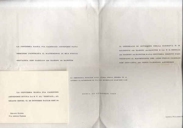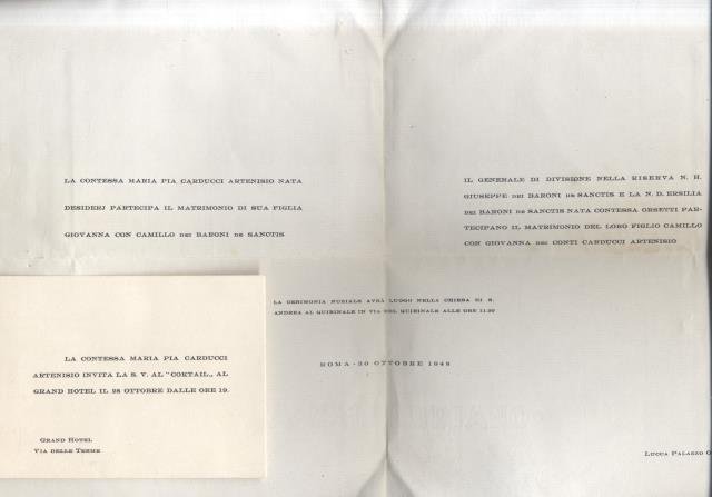 Partecipazione di nozze per il matrimonio tra il Barone Camillo De Sanctis di Lucca e la Contessa Giovanna Carducci Artenisio di Roma. Roma, Chiesa di S. Andrea al Quirinale, 30 ottobre 1948.