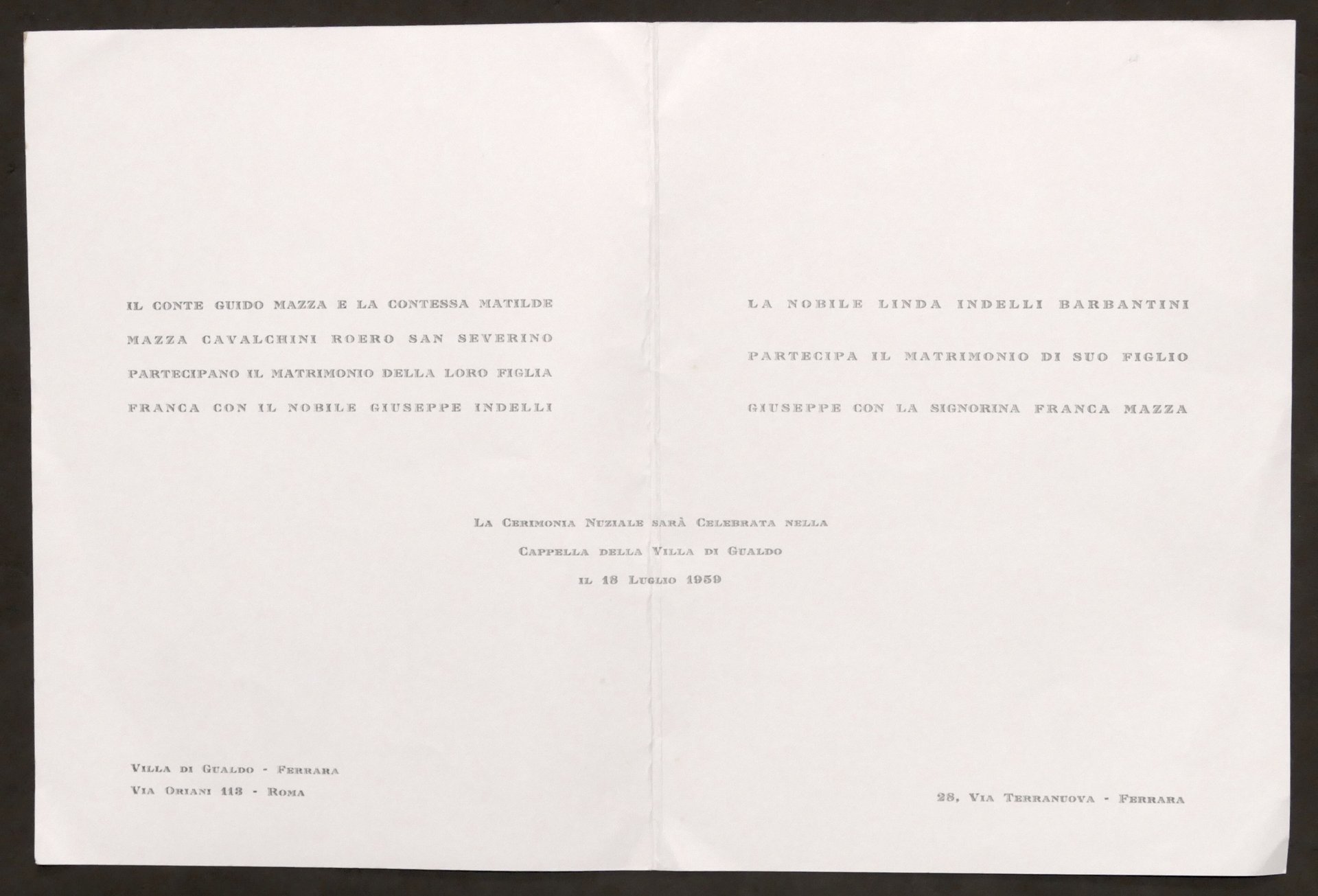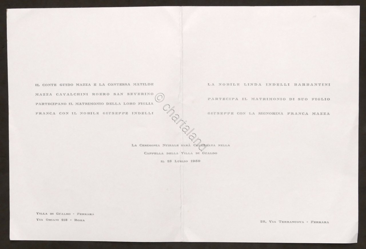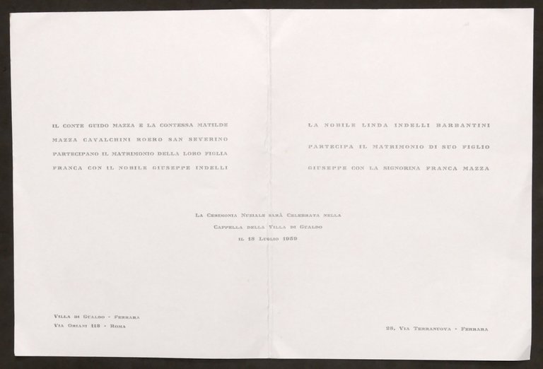 Partecipazioni invito Nozze nobile Giuseppe Indelli e Franca dei Conti Mazza - 1959 Lingua italiana. Condizioni generali molto buone.