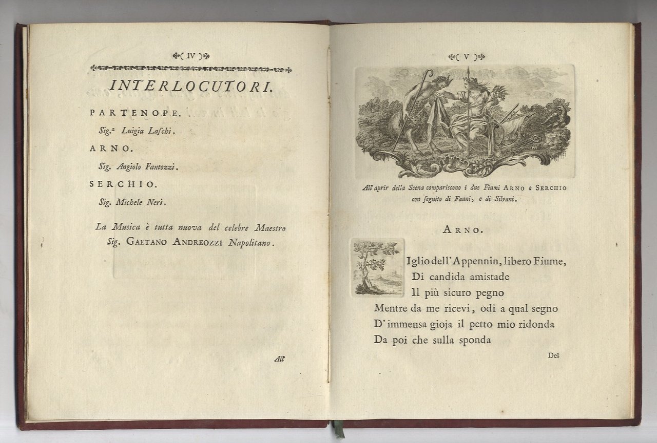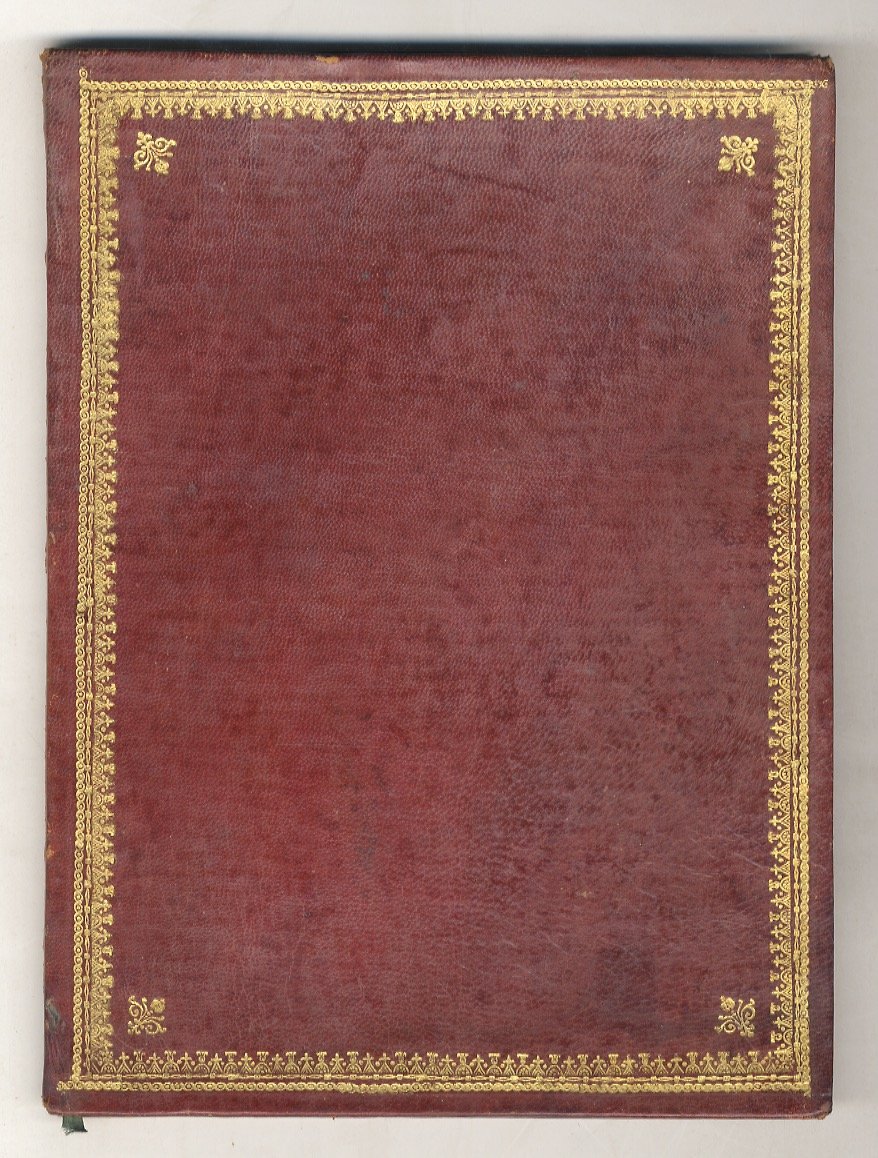 In Lucca, presso Francesco Bonsignori, 1785, in-4, pregevole legatura coeva in pieno marocchino bruno-rossastro, piatti inquadrati da fascia in oro formata da tre cornici concentriche dorate impresse a rotella (a volute, a catenella e a motivi fitomorfi), singoli ferri floreali agli angoli interni, dorso liscio con piccolo ferro fitomorfo in oro ripetuto, sguardie in carta marmorizzata, tagli dorati, nastrino segnapagine in seta, pp. [2], XXV, [1]. Con frontespizio calcografico, due iniziali, una testata e due finalini incisi in rame. Prima edizione del dramma teatrale per musica scritto da Cristoforo Boccella e musicato da Gaetano Andreozzi (1755-1826). Lo spettacolo venne rappresentato al Teatro Castiglioncelli di Lucca in occasione della visita di Ferdinando IV, Re delle due Sicilie, e di sua moglie Maria Carolina d'Austria. Sono presenti anche i nomi dei cantanti. Eccellenti condizioni.