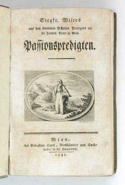 XVI, (2), 434, (2) SS. Mit gest. Titelvignette (Mansfeld inv. & sc.). Interimspappband der Zeit. 8vo. Einzige Ausgabe. - Der aus Günzburg gebürtige Piarist Wiser (1752-1810) erwarb sich in Wien "in der Pfarrkirche Maria Treu seines Ordens als Kanzelredner großen Ruf. Später zum Professor der Pastoraltheologie an der Wiener Hochschule ernannt, versah er als solcher seit 1793 die Censur theologischer Schriften [.] Zuletzt verfiel er in Geisteszerrüttung und kam in das allgemeine Krankenhaus in Wien, in welchem er, 57 Jahre alt, seinem Leiden erlag" (Wurzbach). - Unbedeutend braunfleckig. Aus der Stiftsbibliothek Kremsmünster (OÖ) mit entspr. Signaturschildchen am Deckel. - Wurzbach LVI, 54. Nicht bei Wernigg.