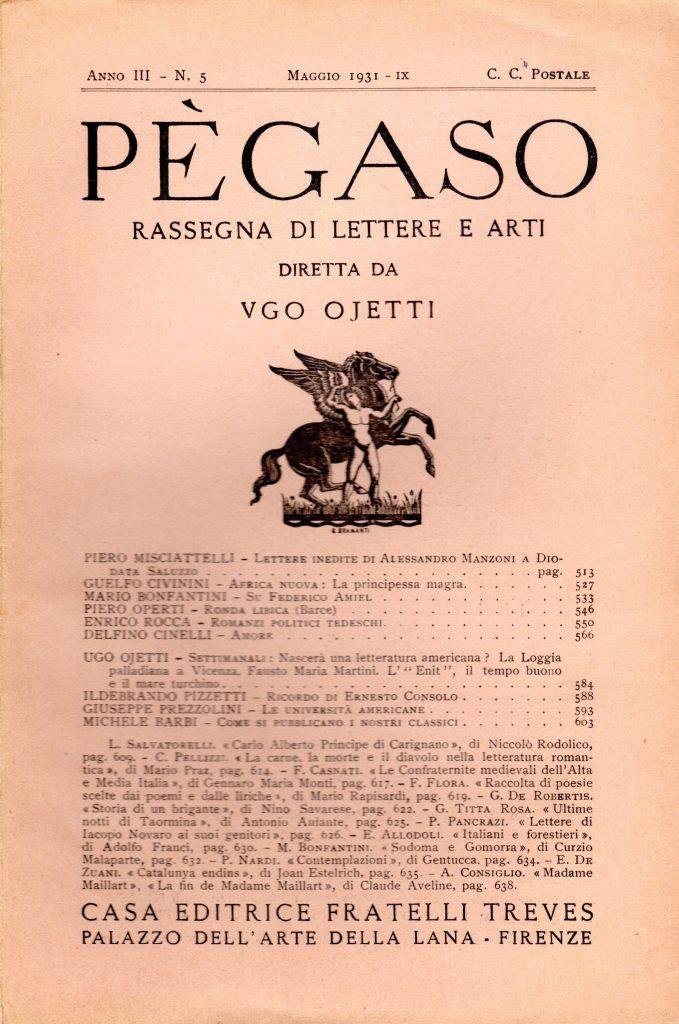 Pegaso anno III n. 5, prima edizione maggio 1931, formato 16,5 x 24,5.<BR>Copertina morbida di colore beige con titoli in nero al piatti anteriore e sul dorso.All'interno interventi di: Piero Musciattelli, Guelfo Civinini, Mario Bonfantini, Piero Operti, Enrico Rocca, Delfino Cinelli, Ugo Ojetti, Giuseppe Prezzolini.<BR><BR>Ottime condizioni.