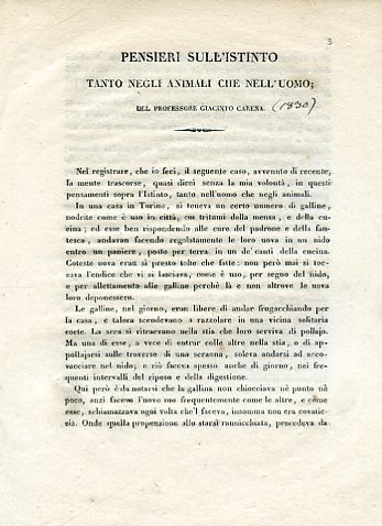 In-4°, pp. 12, cartonatura marmorizzata novecentesca. Annotazioni marginali coeve. Buon esemplare. Estratto dall'Antologia: giornale di scienze, lettere e arti' del 1830. 'Nelle azioni degli animali, quantunque ristrette entro limiti assai più angusti, ogni cosa è perfetta e divina, perchè ogni cosa tende infallantemente al divino scopo della Creazione e della Conservazione di questo gran Tutto che si suol chiamare Universo; il qule è sì metodico, sì maraviglioso, sì maestrevole, sì divino, che niuna mente, se non mal sana, può crederlo fabbricato a chius'occhi dal caso'. Giacinto Carena (Carmagnola, 1778-Torino, 1859) fu Cavaliere del Merito Civile di Savoia, fisico, letterato, autore del 'Vocabolario domestico' e del 'Vocabolario metodico d'arti e mestieri'.