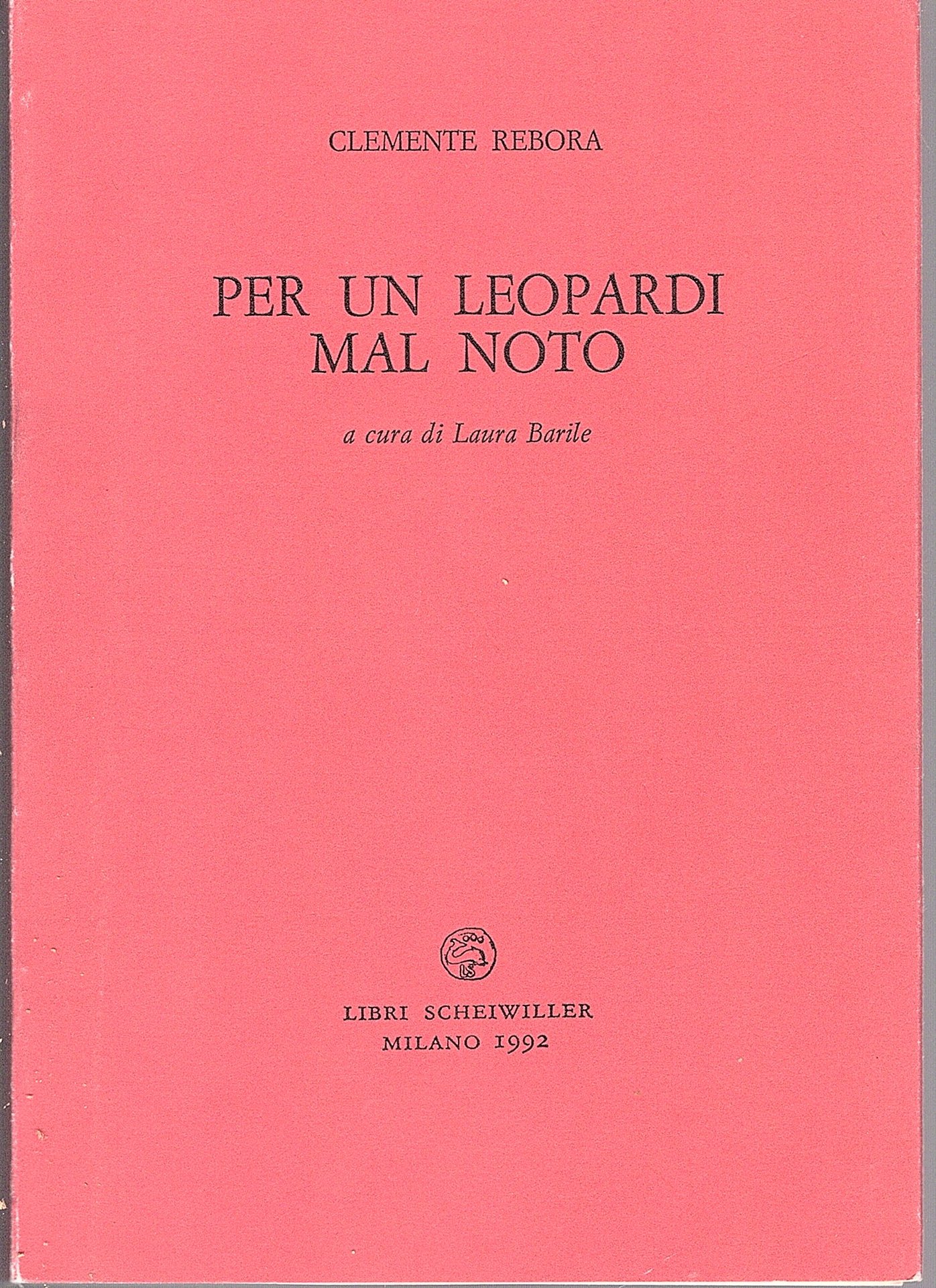 In-16° (17 x 12 cm), pp.176 (6), brossura editoriale rossa ad alette paratestuali, con titoli in nero al piatto anteriore e marca editoriale, ugualmente al dorso, leggerissimo deperimento cromatico alle pieghe delle alette e ai lati del dorso. Ottimo esemplare Prima edizione della collana 'Prosa' (n. 44), esemplare numerato (229), tirato a 600 copie. .' in questa tesina di laurea, pubblicata nel 1910, Rebora tentò di scavare un percorso di estetica musicale all'interno del pensiero di Leopardi: il quale nello Zibaldone, secondo le sue parole, non tanto aveva sisteato, quanto sofferto il proprio pensiero'.