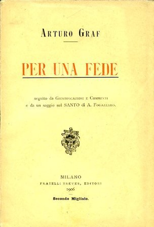 In-8°, pp. (6), 115, (3) di segnalazioni editoriali, brossura originale con titolo in rosso e in nero. Minimi segni del tempo e d'uso ma più che buon esemplare. Prima edizione (secondo migliaio) di questo intenso libretto in cui Graf motivò le ragioni della sua conversione alla fede cattolica, maturata dopo molti anni vissuti in un tormentoso agnosticismo e dopo una serie di tragiche vicende familiari, tra cui il suicidio di suo fratello, Ottone, 'io ho fede che la suprema legge del mondo sia, non una legge fisica, ma una legge morale'. Cfr. Lorenzo Bocca, 'Meccanica, ti saluto!'. Intorno a 'Per una fede' di Arturo Graf in Critica letteraria, n. 4, 2005, pp. 677-697.
