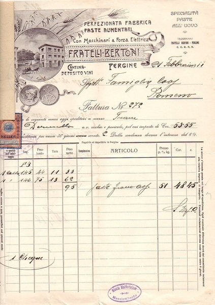 Foglio con fori per raccoglitore di formato 30x23 cm. Condizioni : USATO - Stato : Buono, ordinari segni d'uso e del tempo. Altre note : Fattura compilata a china nel 1911 ed indirizzata alla Famiglia Cooperativa Romeno. Nella vedutina è inciso a due colori lo stabilimento con in primo piano un carro trainato da un asino. Sotto alla vedutina sono presenti le medaglie guadagnate dallo stabilimento. Incollato alla fattura c'è il certificato di ricevuta.