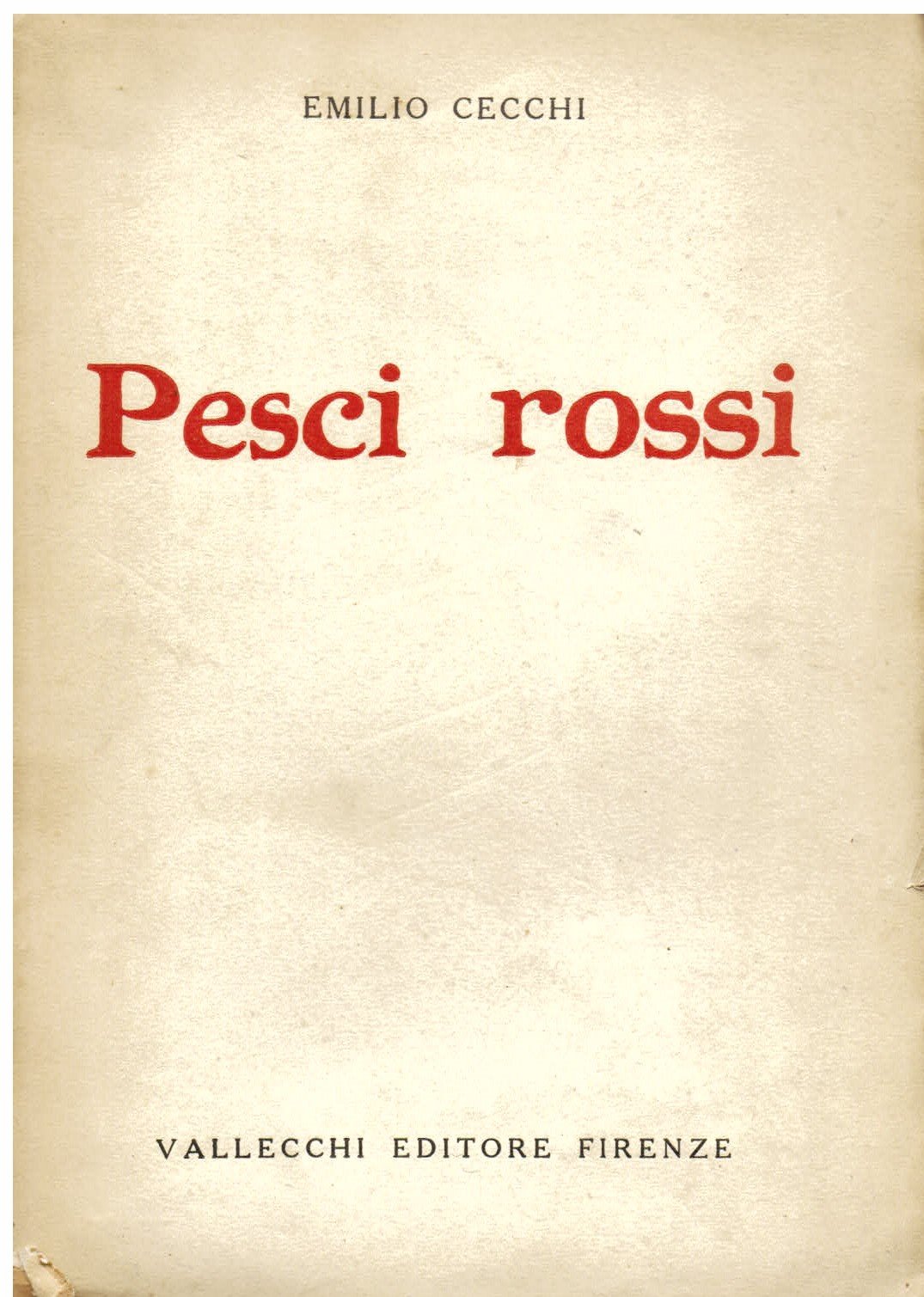 In-8°, pp. 151, (3) + 6 di catalogo editoriale, brossura originale. Bell'esemplare. Prima edizione di uno dei vertici della prosa d'arte del '900 italiano. '.Usciva Pesci rossi, il libro che viene considerato il suo più caratterizzante, raccolta di prose scritte fra il '16 ed il '19: diciassette (in realtà diciotto, perché una è fusione di due scritti) pubblicate sulla Tribuna, e tre sulla Ronda (una uscì però anche negli Annali di filologia). Le occasioni sono varie: avvenimenti pubblici e privati, talvolta cronaca minima, letture, incontri, ricordi di persone, osservazioni della natura animale e vegetale. Col libro - l'unico che resterà inalterato nelle successive edizioni - il Cecchi. inaugura un nuovo genere che campeggerà nel panorama letterario italiano fra le due guerre. Nelle soluzioni migliori è il critico che controlla lo scrittore, e la misura della prosa dipende dal rapporto tra le due qualità, ma i risultati tendono ad una sorta di lirismo sorvegliato e contenuto, al punto di ingenerare un senso di distacco scambiato talvolta per impassibilità. Il correttivo consiste in un'apertura verso l'arguzia, verso un umorismo scaltro e copertamente scanzonato.' (Felice Del Beccaro in D.B.I., 23, 1979). Gambetti / Vezzosi, p. 1014. Spaducci, p. 84.